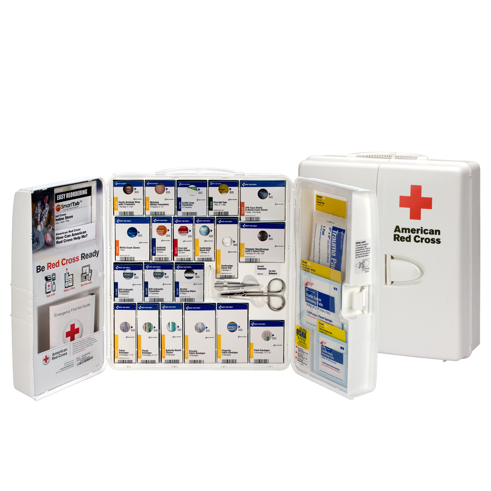 The American Red Cross Workplace Cabinet for Food Services and Medical Offices is guaranteed OSHA compliant 24/7 with first aid regulations in the workplace. The kit can be wall-mounted, and will service up to 50 employees.This kit contains easy to identify blue bandages, burn relief creams and eye wash--essential in kitchens, restaurants and medical offices. The revolutionary SmartTab; ezRefill indicators alert you when it is time to reorder, and the snap-in refill packs keeps contents organized. OSHA Compliant.